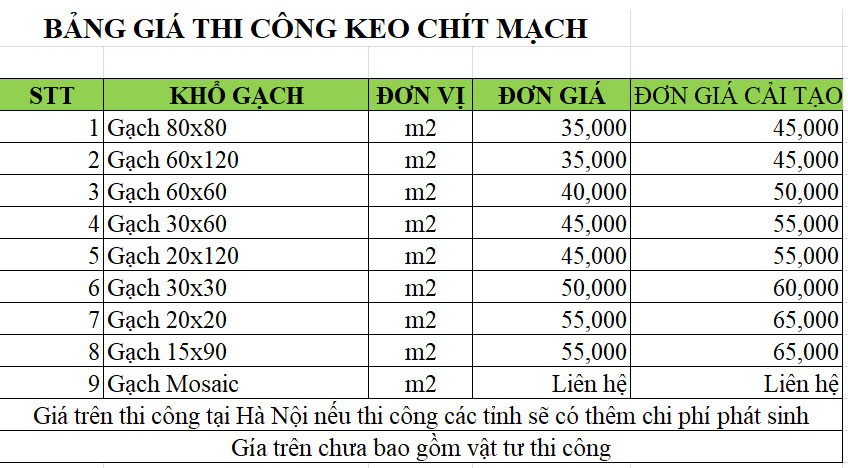 So Sánh Bảng Giá Thi Công Keo Chít Mạch Gạch Saveto Của Các Nhà Thầu